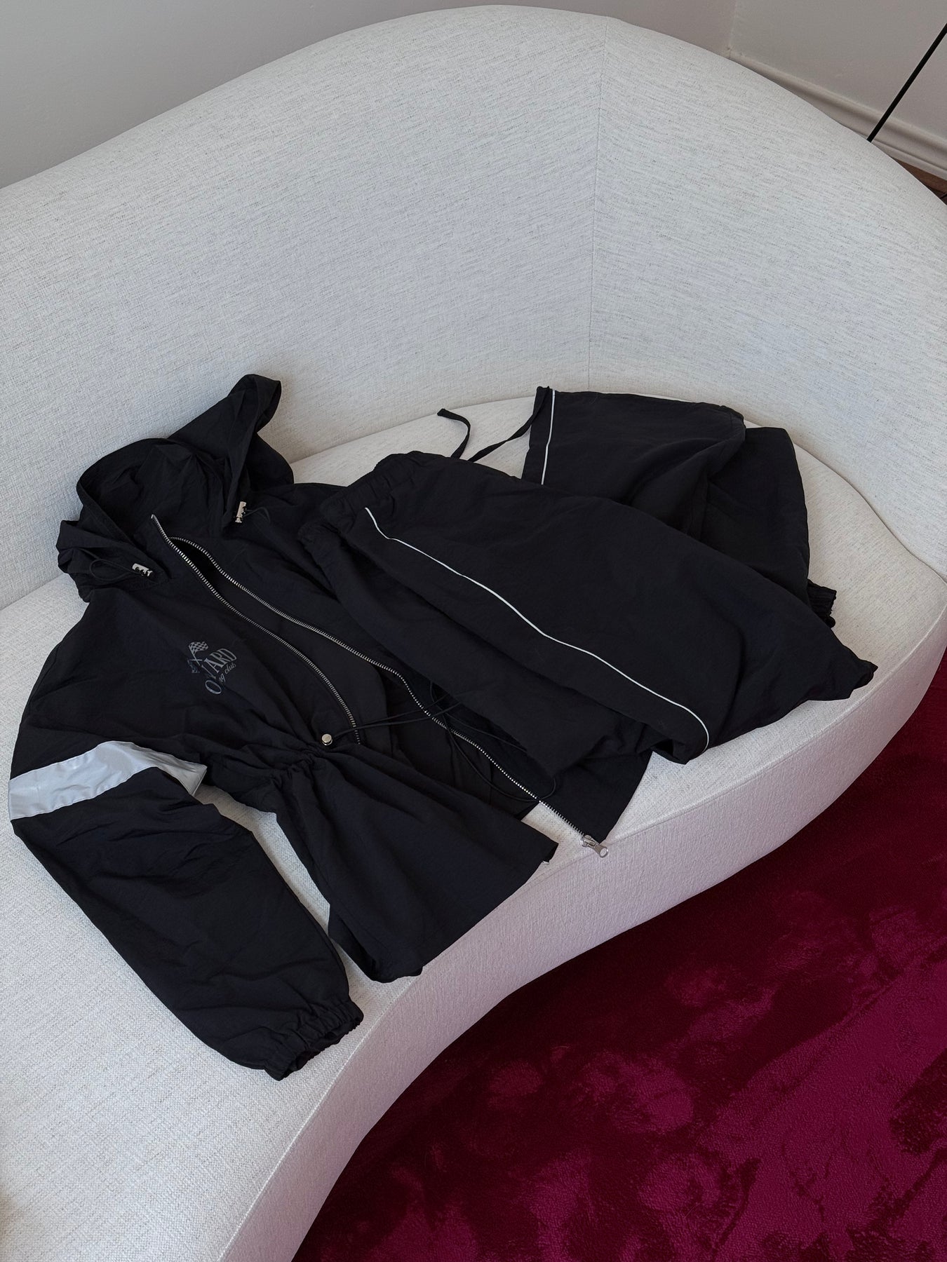 Hecho en tela técnica repelente al agua con detalles en platiado con logo "O'Ward Racing Club."